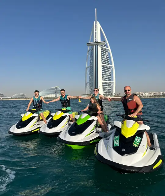 Your adventure begins at our Jumeirah base, where our team will provide a comprehensive safety briefing and training on operating the easy-to-handle Yamaha jetskis. Once you’re geared up and feeling confident, you’ll power up and follow your expert guide out onto the water. Feel the freedom and exhilaration as you speed towards the iconic sail-shaped silhouette of the Burj Al Arab. We’ll pause at the best vantage point, giving you a fantastic opportunity to take stunning photos and selfies. This tour packs maximum fun and one of Dubai’s most famous views into 30 thrilling minutes!